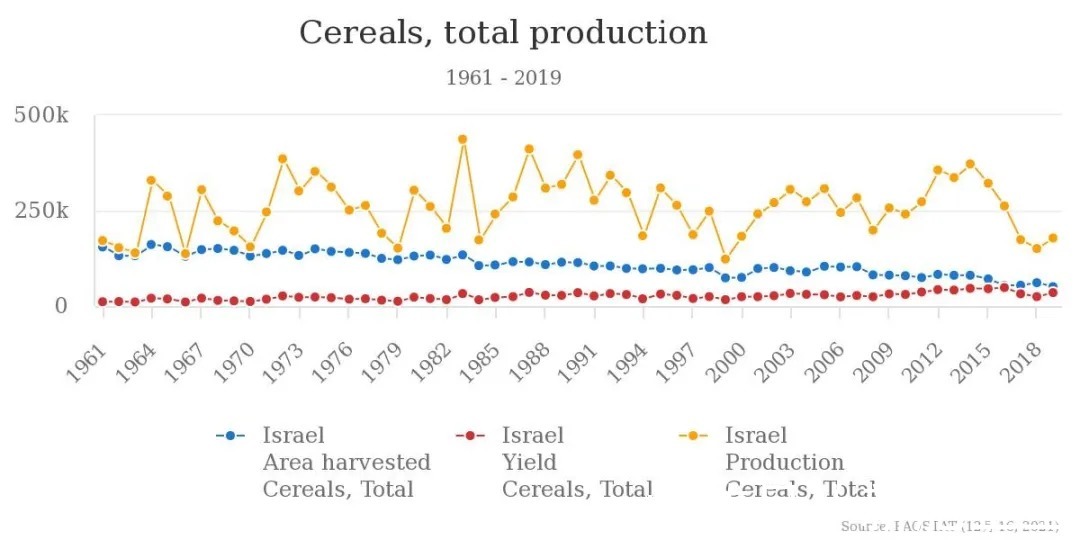 单产基本没有变化,2019年以色列谷物平均单产仅3.5吨/公顷,相比而言,2019年中国粮食作物平均单产为5.7吨/公顷。